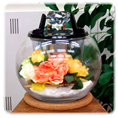 ●デザイン性の高い、上部に設置されたクリスタル製ダイアモンドと球形ガラスのボディを、更に華やかに演出するために、ボディ内に造花、ぬいぐるみ(オプション)等の他、内側を銀色に塗装するなどオリジナル製品を提案します。